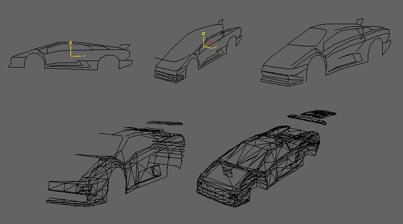 Nevertheless, I've learned much from this game. I started using 3D tools to build the cars with only a few pics downloaded from the internet. I also learned how to set up materials and how to split "complex" meshes (they only have a few thousand polygons) into parts, that can be handled by the 3D programm I was using (it was called Top Model). I also learned how to create a smooth mesh by doing proper polygon distribution and so on. Because especially for cars, with all that soft and rounded shapes, every hard or misplaced edge will show in the render. I also learned how to switch to the PC and to 3D Studio Max 2.5 for performance sake and for better handling and rendering. And therefore .dxf became my best friend :)